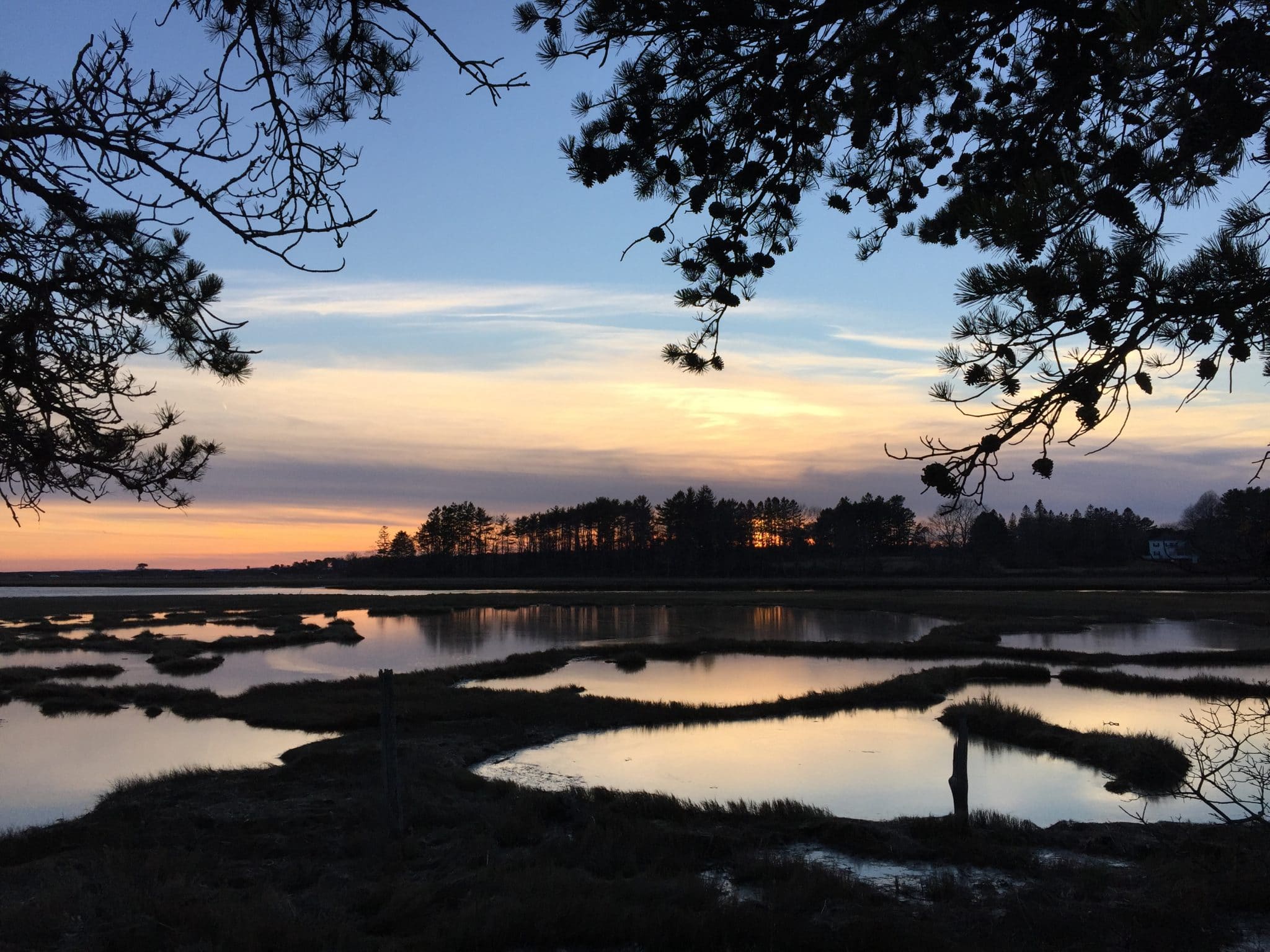 A coastal salt marsh preserve with forested sections and low shrubland offering great habitat for birds and waterfowl.